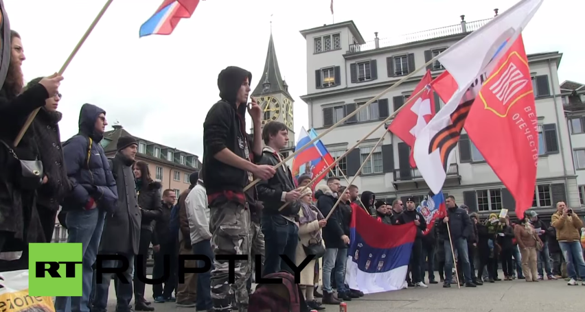 Otra manifestación similar se celebró el sábado fuera del ayuntamiento de la ciudad suiza de Zúrich, en la cual los participantes gritaron lemas contra el Ejército ucraniano por matar a civiles y actuar de manera conjunta con la OTAN.