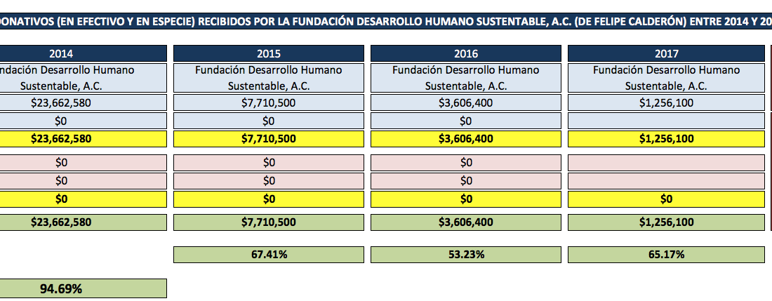 #DatosCerrados | A la Fundación Desarrollo Humano Sustentable del ex Presidente Felipe Calderón Hinojosa no le ha ido bien. Ello, si se observa el declive en el monto de sus donativos. Si el primer año de sus trabajos –2014–, la asociación recibió 23.6 millones de pesos, en 2017 apenas tuvo 1.2 millones de pesos.