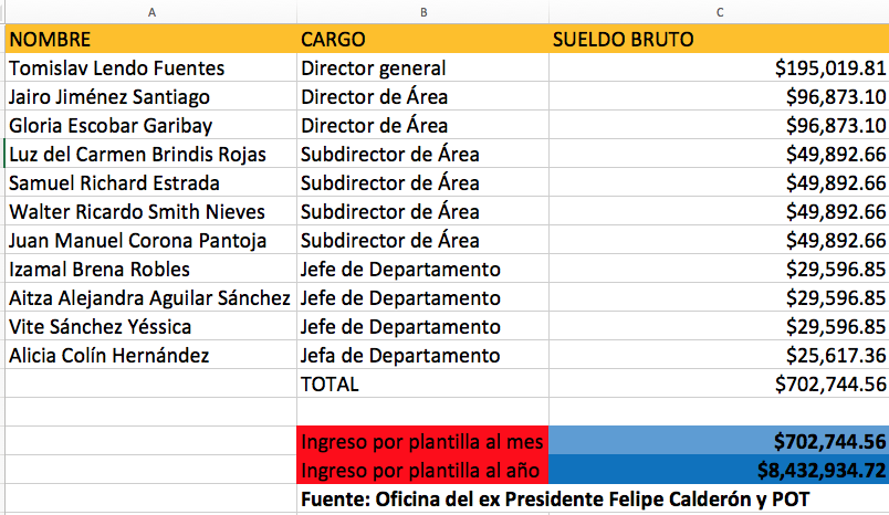 El sueldo mayor en la plantilla del ex Presidente Felipe Calderón es el de Tomislav Lendo Fuentes quien funge como Director de la FDHS y percibe al mes 195 mil 19 pesos con 81 centavos. Luego hay dos Direcciones de Área ocupadas por Jairo Jiménez Santiago y Gloria Escobar Garibay con salarios brutos para cada uno de 96 mil 873 pesos con 10 centavos. El menor ingreso es para una jefatura de departamento en este momento ocupada por Alicia Colín Hernández.