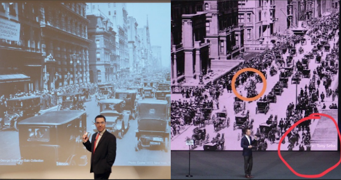 Presto en su defensa, el político queretano negó haber plagiado el discurso de Seba y Diamandis. En cambio, explicó que plagiar es cuando uno evita dar crédito a alguien por utilizar sus ideas. Y acto seguido, Anaya compartió en redes sociales un par de imágenes del evento en que supuestamente plagió el discurso, diciendo que sí había dado crédito a los oradores ya que, en lo proyectado al fondo del escenario, al pie derecho de una foto de antaño, se observa la frase “Fuente: Tony Seba”.