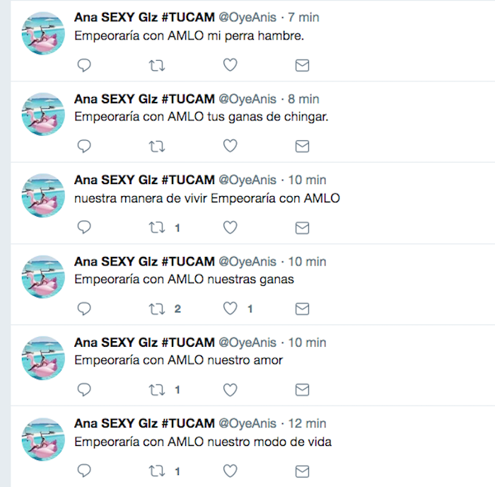 El 1 de abril los tweeteros #TUCAM realizaron un intento fallido por afectar a los miles de simpatizantes que colocaron la tendencia #AMLOPresidente en el primer lugar de las preferencias. Con la frase “Qué Horror Obrador”, los opositores al candidato realizaron la misma práctica de publicar de manera simultánea la misma oración en cada una de las cuentas participantes, entre las que destacaron las que llevan por nombre “Chochos”, el popular influencer que ha sido bloqueado en ocasiones anteriores por Twitter debido a que violó varias reglas de la red social y que se define de manera abierta como crítico hacia AMLO.