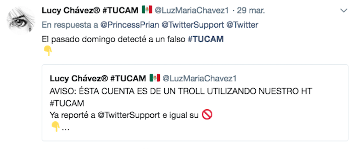 @LuzMariaChavez1 dio la directriz de emplear la etiqueta #Tucam como distintivo, comenta numerosas veces al día, e identifica y expone infiltrados, que de manera posterior denuncia a la red social para solicitar su bloqueo.